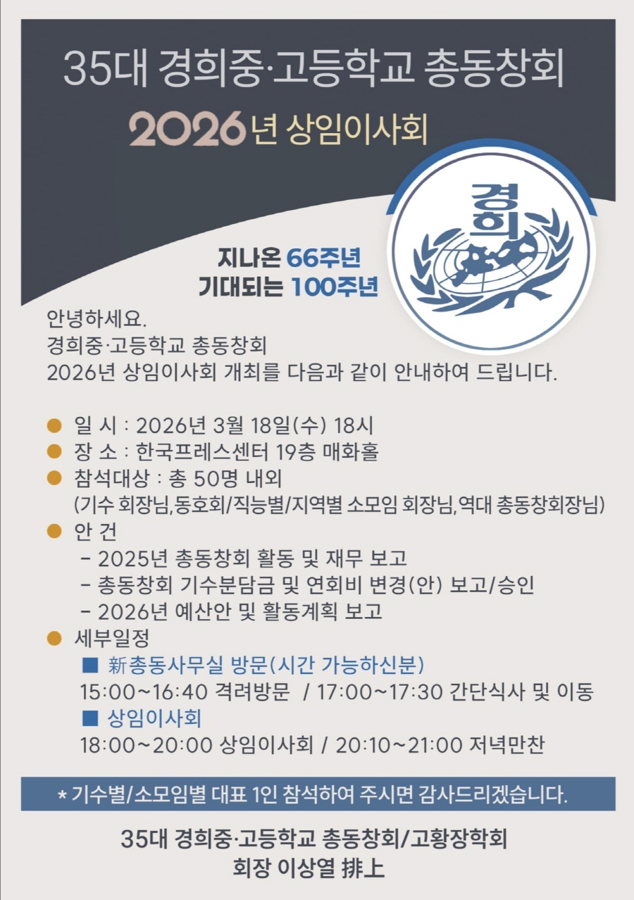 Copyrights(c) 경희중고등학교 총동창회. All rights reserved.