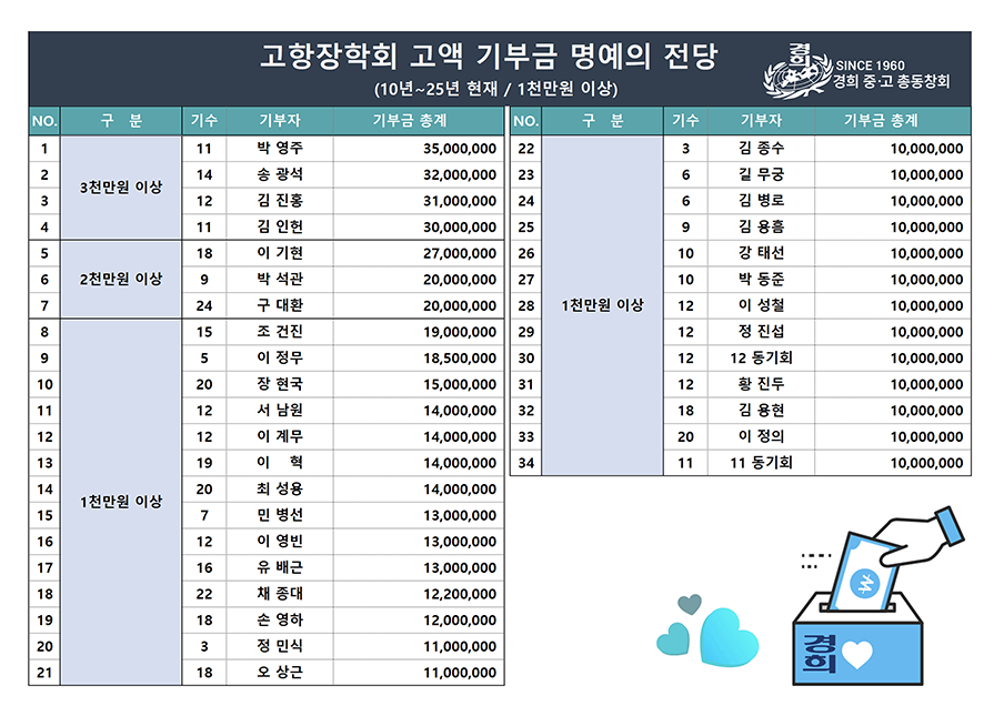 고황장학회 고액 기부금 명예의 전당 (10년~25년 말 / 1천만원 이상